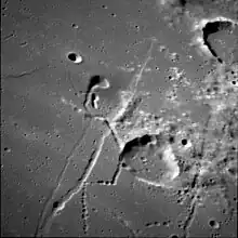 Vicinity of Lubbock H crater with intersecting rilles, and Lubbock in upper right, from Apollo 11