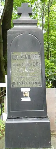 Lucien Olivier (Russian: Люсьен Оливье) (1838–14 November 1883) was a Russian chef of Belgian and French descent[1] and owner of the Hermitage restaurant in the center of Moscow, Russian Empire, in the early 1860s. He was born in Moscow. Olivier is known for the creation of Olivier salad, also known as "Russian salad". The secret of the recipe was not disclosed until his death. Lucien Olivier died in Yalta from heart disease at the age of 45 in 1883 and was buried at Vvedenskoye Cemetery. His tomb was lost until 2008.[2] The current salad has numerous variations which are a mixture of every component Olivier used to add to his famous dish, as well as ingredients that he did not use himself, with a mayonnaise dressing.