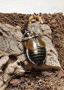 L. verrucosa grows to a length of about 4 cm (1.6 in) and is mainly black or dark brown with a white margin to the dorsal sclerites. It is sexually dimorphic, with males being slightly smaller than females and having a pair of large, usually yellow spots on the pronotum.[2] These are covered by a thin translucent cuticle and have traditionally been thought to be luminescent organs.[3] However researchers noticed that when in captivity these cockroaches were fed on carrots, the colour of the spots deepened to orange or even red. On closer examination the surface of the cuticle bears a number of small knobs each bearing a small mechanoreceptor. The upper surface of the spots is partially obscured by a pad of enlarged fat body cells which accumulate carotenoids on a diet of carrots. Insects are unable to synthesize carotenoids and the presence of orange or red spots may indicate a well-fed, fit individual. The researchers found no evidence of light emission but hypothesized that the pigmented spots may play a part in male aggression or mate choice by the female, or may provide warning signals.[4]