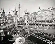 Thompson and Dundy planned to add new rides including a flower garden, a German village, and a Trip to the Moon attraction.[20] The lagoon and the Shoot the Chute attraction were the only parts of Sea Lion Park to be retained.[9][10][20] Early plans called for Luna Park to include a tower with 38,000 lights.[13] The park's original rides and attractions also included an infant incubator, a Shoot the Chute ride, a three-ring circus, and a Fire and Flames show that employed over a thousand performers.[25] Luna Park unofficially opened on April 5, 1903, with a live show.[26][27] The same month, Leo Wyent and George M. Foley sued to prevent Thompson and Dundy from issuing a concession allowing a third party to sell cigars and alcoholic beverages at the park.[28] Thompson and Dundy planned to sell alcoholic beverages at one location in the park, the German Village.[26]