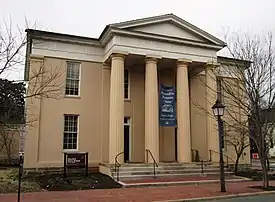 Constructed in the then-popular Greek Revival style from bricks recycled from the original St. Mary chapel,[4] it originally was intended as a permanent home for scholarly activities. It hosted both the Alexandria Lyceum (which featured speakers including John Quincy Adams) and the Alexandria Library. During the American Civil War, it served as a hospital. After the war, the Lyceum was dissolved and John Bathurst Daingerfield bought the building for his daughter Mary Helen and her husband, Philip Hooe, who was a descendant of the town's first mayor, merchant Robert Townshend Hooe. It later served as an office building, so virtually none of the original woodwork remains. During the New Deal it was recognized by the Historic American Buildings Survey (HABS).[5] In 1937, a separate building was constructed about four blocks north (on the site of the former Quaker graveyard) to house the growing city's library, which was the scene of a sit-in in 1942 and now is one of several branches.