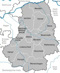 The Märkischer Kreis is a district (Kreis) in central North Rhine-Westphalia, Germany. Neighbouring districts are Unna, Soest, Hochsauerland, Olpe, Oberbergischer Kreis, Ennepe-Ruhr, and the city of Hagen.