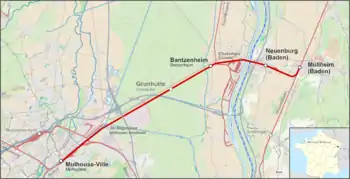 The Müllheim–Mulhouse railway is a 22.140 km-long single-track railway, crossing the Upper Rhine between Baden, Germany and Alsace, France. The whole line is electrified with catenary, using different national electrification standards on either side of the Rhine.[2] It branches off the Rhine Valley Railway (Rheintalbahn) in Müllheim and it connects with the Paris–Mulhouse railway and the Strasbourg–Basel railway in Mulhouse.