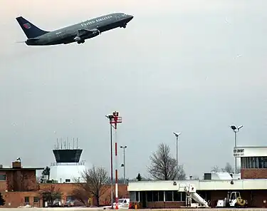 - United Airlines provided MBS with mainline service since commercial service was started. In the 1980s and 1990s, United linked MBS with Chicago using Boeing 737 and 727 aircraft. Service to Denver, Colorado, also existed in the 1980s. Mainline United left MBS in the 2001, and was replaced with United Express, which still serves MBS with service to Chicago's O'Hare International Airport using mostly 50-seat aircraft.