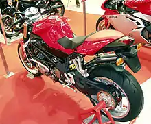 In late 2005, a larger 910 cc engine was added to the range. The 998 cc engine from the F4 1000 S was taller than the 750 cc unit and could not be fitted.[5] The 750 engine's bore was increased by 2.2 mm to 76 mm and the stroke by 6.3 mm to 51 mm to give 909 cc displacement.[6] A top of the range model using the 1078 cc engine from the F4 was added in 2007,[7] and a 982 cc variant in 2008.[8]