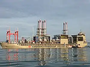 The MV Karadeniz Powership Gökhan Bey is Liberia-flagged floating power plant, owned and operated by Karpowership. In 2016, she was solemnly sent off from the Sedef Shipyard in Tuzla, Istanbul, Turkey together with the MV Karadeniz Powership Yasin Bey to Indonesia to supply electricity to the power grid. She has a generation capacity of 125 MW.[3]