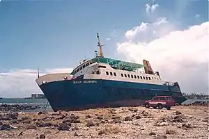 In February 1990 during Cyclone Ofa the ferry broke its moorings in Apia harbour and was washed ashore on the Apia waterfront. It was refloated in July 1990 and towed to Nelson, New Zealand for repairs.[7] Increased maintenance costs and safety concerns following the repairs caused the Samoan government to ask the government of Japan to design and construct a replacement vessel.[8]