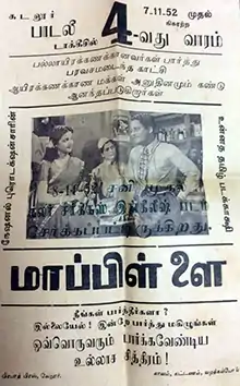Maappillai (transl.Son-in-law) is a 1952 Indian Tamil-language drama film[1] directed by T. R. Raghunath and written by V. N. Sambandam. The film stars T. R. Ramachandran, P. K. Saraswathi and T. K. Ramachandran. It revolves around an office boy who becomes wealthy in a rags to riches manner, and the attempts made by his boss's son to destroy him and usurp his wealth.[2] The film was released on 7 November 1952 and became a success.
