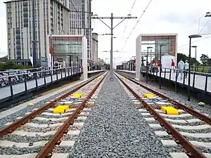 Steendijkpolder is a metro station on Line B of the Rotterdam Metro located in Maassluis, South Holland. The station entered regular service on 30 September 2019.[1] Whereas located on the former Hoekse Lijn, converted from a railway, this is the only station of the line which never was a railway station and was constructed in 2019, when the railway was converted into rapid transit. Steendijkpolder consists of a side platform for westbound services toward Hook of Holland, and an island platform used by eastbound services toward Nesselande.
