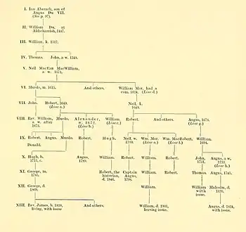 John Mackay, 1st of the family of Aberach was a younger son of Angus Du Mackay, 7th of Strathnaver, chief of the Clan Mackay. His mother was a daughter of Alexander Carrach MacDonald, chief of the Clan MacDonald of Keppoch, who in turn was a son of John of Islay, Lord of the Isles (chief of Clan Donald) whose wife was a daughter of Robert II of Scotland.[3]