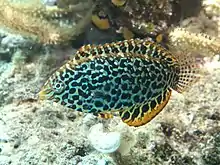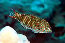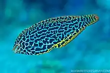 Macropharyngodon meleagris, the black-spotted wrasse, Eastern leopard wrasse or reticulated wrasse,[3] is a species of ray-finned fish from the family Labridae, the wrasses. This species is native to the eastern Indian Ocean and the Pacific Ocean. It lives on coral reefs at depths of from the surface to 30 metres (98 ft). This species can reach a length of 15 centimetres (5.9 in) SL. It can also be found in the aquarium trade.[2] Juveniles display different color patterns than adults with dominating light colors and eyespots blending in with soft coral habitats and potentially avoiding predation.[4]