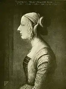 Maddalena de' Medici (25 July 1473–2 December 1528) daughter to Lorenzo de' Medici[1] Born in Florence, she was educated with her siblings to the humanistic cultures by figures such as Angelo Poliziano.[2] In February 1487 she was engaged to be married to Franceschetto Cybo, son of Pope Innocent VIII.[3] They were married in January 1488, and she brought a dowry of 4000 ducats.[3] This marriage brought closer connections for her family and the Vatican, helping her brother Giovanni get appointed as a cardinal.[3] She used her influence with her father, her brother Piero, and the pope to help friends and poorer people get aid and positions within the church and governments.[4]