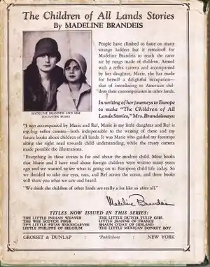 Brandeis was best known for her "Children of America" and "Children of All Lands" series of books. Most of the fictional stories included photographs taken by the writer, with child actors as the books' characters.