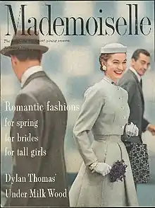 Mademoiselle, primarily a fashion magazine, was also known for publishing short stories by noted authors including Truman Capote, Joyce Carol Oates, William Faulkner, Tennessee Williams, James Baldwin, Flannery O'Connor, Sylvia Plath, Paul Bowles, Jane Bowles, Jane Smiley, Mary Gordon, Paul Theroux, Sue Miller, Barbara Kingsolver, Perri Klass, Michael Chabon, Mona Simpson, Alice Munro,[2] Harold Brodkey, Pam Houston, Jean Stafford, and Susan Minot. Julia Cameron was a frequent columnist.[3] The art director was Barbara Kruger,[4] then it was Cipe Pineles who became it from 1961.