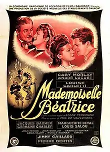 Mademoiselle Béatrice is a 1943 French comedy film directed by Max de Vaucorbeil and starring Gaby Morlay, André Luguet and Louise Carletti.[1] The film's sets were designed by the art director Raymond Druart.