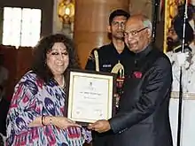 On International Women's Day in 2018 Jain was given the Nari Shakti Puraskar[4] for her work with textiles[5] and in particular for empowering women.[6] The award was made at the Presidential Palace (Rastrapati Bhavan) in New Delhi by the President of India Ram Nath Kovind witnessed by the Prime Minister of India, Narendra Modi and the Minister for Women & Child Development, Maneka Sanjay Gandhi. About 30 people and nine organisations were recognised that day, receiving the award and a prize of 100,000 rand.[7][6]