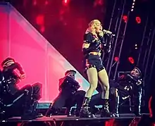 Gay culture is represented in many of her works,[15][33] with some of her songs and other projects grounded in queer sensibility,[16] including the documentary Truth or Dare, and music videos for her songs "Justify My Love", "Erotica", and "Vogue" in early 1990s.[15] The music video for "God Control" was reminiscent of the 2016 Orlando nightclub shooting.[34][35]