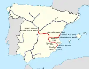 | Madrid–Levante high-speed rail network | |||||||||||||||||||||||||||||||||||||||||||||||||||||||||||||||||||||||||||||||||||||||||||||||||||||||||||||||||||||||||||||||||||||||||||||||||||||||||||||||||||||||||||||||||||||||||||||||||||||||||||||||||||||||||||||||||||||||||||||||||||||||||||||||||||||||||||||||||||||||||||||||||||||||||||||||||||||||||||||||||||||||||||||||||||||||||||||||||||||||||||||||||||||||||||||||||||||||||||||||||||||||||||||||||||||||||||||||||||||||||||||||||||||||||||||||||||||||||||||||||||||||||||||||||||||||||||||||||||||||||||||||||||||||||||||||||||||||||||||||||||||||||||||||||||||||||||||||||||||||||||||||||||||||||||||||||||||||||||||||||||||||||||||||||||||||||||||||||||||||||||||||||||||||||||||||||||||||||||||||||||||||||||||||||||||||||||||||||