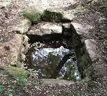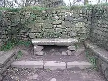 The nearby Madron Well, which is now concealed in shrubs and undergrowth, is an example of a Cornish Celtic sacred site and is a ground level natural spring.[6] The well is said to have healing properties and a 17th-century written account tells how, before 1641, John Trelille, a poor cripple, was cured here when he bathed in the water, then slept on a grassy hillock. The hillock was remade every year and was called St Maderne's bed.[6] An old May Day tradition, which was still being observed in 1879, was for many young folks (mainly girls) to head from Penzance before sunrise, to perform a ceremony, to learn the number of years they have to wait before they get married. Two grass stems or straw, each about an inch long were fastened together with a pin and dropped into the water. Any rising bubbles denote the number of years before they get married. The ceremony was no longer held on May Day, but on a Sunday, because the girls work during the week.[10] A tradition at this site persists to this day whereby people attach pieces of rag (clouties) to the nearby bushes as a symbol of appeasement to the spirits within the well (see also Clootie well) – according to a contemporary report in The Cornishman newspaper that tradition was no longer carried out in 1879.[10]