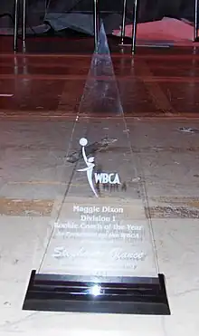 The Maggie Dixon Division I Rookie Coach of the Year Award is an award given annually since 2007 to the head coach in women's college basketball in the NCAA Division I competition who achieves great success in their first year as a Division I head coach. Given by the Women's Basketball Coaches Association, the award is named for former women's head coach Maggie Dixon, who coached at Army for the 2005–06 season before suddenly dying due to valve complications from an enlarged heart.[1] Dixon had been named head coach just 11 days before the start of the season but led the Black Knights to a 20–11 record and won the Patriot League tournament championship.[2] It was Army's first basketball team, men or women, to play in the NCAA Tournament. Although Army would lose in the first round to Tennessee, Dixon was named the Patriot League Coach of the Year and received much praise from the college basketball community for her coaching job in just her first season. On April 6, 2006, Dixon died at the age of 28 of what her brother Jamie Dixon, then head men's basketball coach at Pittsburgh, described as an "arrhythmic episode to her heart."[2]