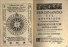 The frontispiece of the first edition is by Claudio Dagli. It depicts the double-headed imperial eagle of the Hapsburg dynasty. It hangs by a magnetised chain from the imperial crown that supports an orb and a cross. Both the crown and the cross are struck through with magnetised arrows pointing towards a heavenly source, but not directly at the all-seeing eye of god directly above - perhaps a reference to magnetic declination.[5]:23 In one of its claws the eagle holds the crowns of Austria, Hungry and Bohemia, held together by magnetism, while in the other it holds the sceptres of the three realms, similarly linked by magnetic force. Arrows from the bird's outstretched wings project imperial power to the lands below.[18] A lodestone on the eagle's breast carries the dedication to Emperor Ferdinand III and a banner above the eagle's head carries the Latin motto Regna Quis Adiunxit Regnis Nova Sceptra Coronis ("He has added kingdoms to kingdoms and new sceptres to crowns"). A second banner curling around its feet carries the Latin pun Et Boreae Et Austri-Acus (""Needle of the north and south - 'austriacus' also meaning 'Austrian').[5]:23 In the third edition the dedication to Ferdinand III is replaced on the breast of the eagle by his portrait.[5]:23