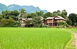 Mai Châu is a mountainous region located in Hòa Bình Province, approximately 135 km from Hanoi and 65 km from Hòa Bình. The east of Mai Châu borders Đà Bắc and Tân Lạc districts, the west and the south border Quan Hóa district of Thanh Hóa province, and the north borders Vân Hồ district of Sơn La province. Mai Châu's terrain is quite complex, divided by slits, streams and high mountains. According to the topographic characteristics, Mai Châu can be divided into two distinct areas: the low region (relatively flat terrain with fertile soil) and the high region (with many high and rugged mountain ranges).[2]