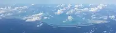Maiana is an atoll in Kiribati and is one of the Central Gilbert Islands. Maiana is 44 kilometres (27 mi) south of the capital island of South Tarawa and has a population of 1,982 as of 2015. The northern and eastern sides of the atoll are a single island, whilst the western edge consists of submerged reefs and many uninhabited islets, all surrounding a lagoon. The atoll is 14 kilometres (8.7 mi) long and is very narrow, with an average width of less than 1 kilometre (0.62 mi) and a total land area (including uninhabited islets) of 16.72 square kilometres (6.46 sq mi).[1]