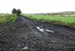 The line between Newton Stewart and Wigtown had no intermediate stops at first however in May 1875 it was decided to locate platforms or halts at Causeway End and Mains of Penninghame.[5] The single platformed station stood on a typical single track section of the branch. Ordnance Survey maps do not clearly indicate the exact location however a map of 1882 gives the name 'Mains Cross Station' and a site to the north of the old kirk where the embankment crosses the Mains of Penninghame Road.[6] A site next to the old Kirk of Penninghame on the route to Mains of Penninghame was close to the Clachan of Penninghame, its farm and public house.[7] No sidings were present however a level crossing is recorded here that may have replaced the road underpass.[8]