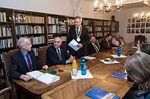 Photo of the ceremonial signing of the agreement on the foundation of mainzed at the Academy of Sciences and Literature Mainz on 6 November 2015 showing from left to right: Prof. Dr. Georg Krausch (JGU), Prof. Dr.Eng. Gerhard Muth (HS Mainz), Prof. Dr. Gernot Wilhelm (ADW), Prof. Dr. Michael Matheus (IGL), Prof. Dr. Falko Daim (RGZM), Prof. Dr. Irene Dingel (IEG). Photographer: Prof. Dr. Ernst-Dieter Hehl.