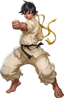 Makoto stands 160 cm tall (5 ft 2 in) and has measurements of 80-61-87 cm (32-24-34 in).[10] During development many designs were proposed with a guideline to include a loose fitting karate gi though the amount of the outfit sometimes varied drastically from one design to the next.[6] The gi was intended to be the oversized and loose fitting on her due to it being her deceased father's.[7] According to the book All About Capcom Fighting Games 1987-2000, due to her behavior and attire she is commonly confused by players to be "Ryu's little sister".[11] Her finalized design consists of a barefoot muscular woman with short black hair wearing a white loose gi, a red halter top underneath her gi resting at her cleavage, a long flowing yellow ribbon around her neck.[9] The ribbon in particular was added by 3rd Strike's development team to demonstrate her speed and trajectory, as well as telegraph to the opponent certain moves Makoto performs.[12]