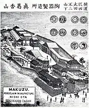 At this time Yokohama still resembled the fishing village it had been, and there was no ceramic or even craft tradition. Suzuki found for Kōzan a site (about 0.3 ha) in Nishiōta (present-day Kanoedai in the central ward of Yokohama). The kiln built there took the name Ōta. The Kantō was also poor in suitable clay, and initially Kōzan had to prospect widely for his materials. Bringing four apprentices from Kyoto, Kōzan by 1872 had overcome the initial problems, and expanded his workshop with a large recruitment of local men and women.[9] This was the period at which modern Satsuma ware was distressed for export as antique, and Pollard considers that, up to 1876 at least, there was truth in the allegation of Frank Brinkley that the Makuzu workshop participated in the fraudulent trade.[10] Johannes Justus Rein visited the business in the mid-1870s.[11]