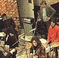 Evans (with hand on hip, behind Ringo Starr) on the Apple Records rooftop during filming for Let It Be