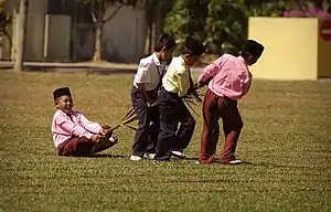 Malay children playing Tarik Upih Pinang, a traditional game that involves dragging a palm frond