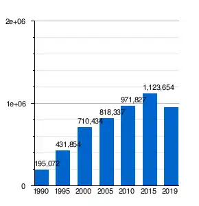 During the 1990s, as Singapore moved to diversify its economy from a manufacturing-based one into a knowledge-based economy, the government relied more on foreign labour to offset Singapore's small local workforce.[17] This resulted in the population of the Malaysian community to increase from a total of 195,072 in 1990, to 431,854 in 1995, a 121% increase within a five year period.[18] By the late 1990s, there were 80,000 employment pass holders and another 450,000 on work permits, with majority being Malaysians, which constitutes 20% of the Singaporean workforce.[17][19]