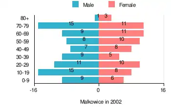 According to the 2002 Poland census, there were 156 people residing in Malkowice village, of whom 53.8% were male and 46.2% were female. In the village, the population was spread out, with 19.9% under the age of 18, 32.7% from 18 to 44, 17.9% from 45 to 64, and 29.5% who were 65 years of age or older.[1]