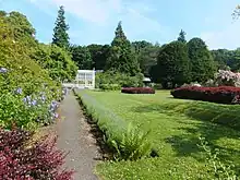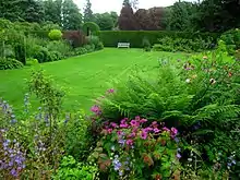 The garden is open to members and paying visitors and consist of a 3-acre (12,000 m2) walled garden set in approximately nine acres of woodland.[8][4][9] The gardens feature four 100-year-old yew trees known as the Four Apostles and was home to Scotland's National Bonsai Collection, which left around 2000 and is now located at Binny Plants near Ecclesmachan.[10] The house is not open to the public.[8] The garden was celebrated in the 17th century for their Dutch-style of gardens.[3] There are over 150 varieties of roses at Malleny, including the National Collection of 19th century Shrub Roses, as recorded by the National Council for the Conservation of Plants and Gardens.[3] The current layout of the garden dates from the mid to late 19th century.[9] The gardens contain two old Victorian glasshouses.[9]