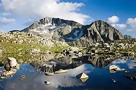 Malokamenishki Lakes are among the largest lake groups in Pirin by number. They are situated at altitudes between 2,537 m and 2,190 m. Two of the lakes have an area of over 10,000 m2, seven between 1,000 and 10,000 m2 and the rest under 1,000 m2. Most of them are swallow and dry out in summer.[3] The highest eleven lakes are scattered in the folds of the Belemeto cirque centered around the eight lake, Tevnoto. Most of them have unreliable water flow and an area under 1,000 m2.