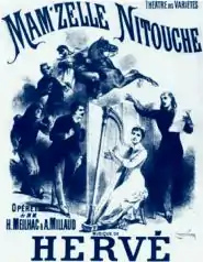 Mam'zelle Nitouche is a vaudeville-opérette in three acts by Hervé. The libretto is by Henri Meilhac and Albert Millaud. This story of a respectable musician, transforming himself into a songwriter at night, is partly inspired by the life of the composer of the piece Hervé, who as Florimond Ronger, his real name, was the organist at the important church of Saint-Eustache, Paris by day and wrote the music for and starred in satirical, irreverent operettas under a stage name at night.[1]