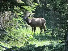 The elk, or wapiti (Cervus canadensis), is one of the largest species of deer in the world and one of the largest mammals in North America and eastern Asia. In the deer family (Cervidae), only the moose, Alces alces (called an "elk" in Europe), is larger, and Cervus unicolor (the sambar deer) can rival the C. canadensis elk in size. Elk range in forest and forest-edge habitat, feeding on grasses, plants, leaves, and bark.