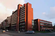 The older part of MBS, called "MBS West" is part of the University Precinct Centre complex on the southwest corner of Oxford Road and Booth Street West. The building houses lecture and conference suites and restaurant facilities including a 101-room hotel that is opening in 2017. It is also the home of the MBA programme. The complex was designed by Hugh Wilson and Lewis Womersley and dates from the 1970s.[31][32] The newer part "MBS East" lies on the northeast corner of Oxford Road and Booth Street East. It was completed in 1997 at the time when the UMIST departments co-located to form the Federal School.[3] The building cost £7m and was designed by London architects ORMS. MBS East currently houses undergraduate services and some of the Research Centres of MBS.