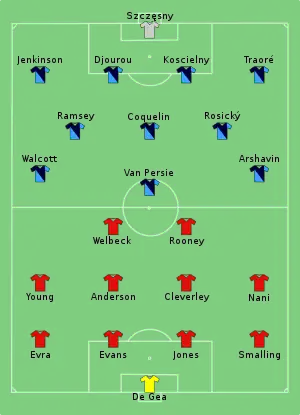 The match kicked off at around 16:00 GMT in front of a crowd of 75,448 at Manchester United's stadium, Old Trafford.[6] United opened the scoring in the 22nd minute, when Welbeck beat Djourou to a scooped pass from Anderson and headed the ball past Szczęsny.[6] Arsenal had a chance to level the scores five minutes later, when they were awarded a penalty for a foul on Walcott by Evans; however, De Gea correctly guessed the direction of Van Persie's penalty kick and pushed the ball around the post.[7] A minute later, Traoré could only clear a cross from Rooney as far as Ashley Young, who controlled the ball, shifted it onto his right foot and curled a shot into the top corner to score his first goal for Manchester United since signing from Aston Villa that summer.[8]