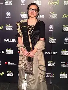 In 1996, Mandali Mendrilla decided to complete her studies at the Rijeka Faculty of Philosophy, where she obtained a Bachelor of Arts degree in English and Croatian language and literature. In that period, she studied Bhakti Yoga and traditional arts of India under tutelage of Kenneth R. Valpey. The studies inspired several art projects, like collaboration with British anthropologist Chantal Boulanger on Vrndavana: The Sari Experiment.[12][13] Mendrilla also finds inspiration in ancient cultures, especially from India.[14] In the United States, Mendrilla's late husband and artist Elisha 'Nitai' Drury's Krishna Kitchen, ended up becoming an integral part of some of the biggest and most exciting alternative festivals of the new millennium; including Burning Man, Wanderlust and Bhaktifest.[15] Mendrilla dedicated an entire collection to commemorate his legacy.[16][17] In 2014 she was featured on the Croatian Fashion Week in Zagreb.[18][19][20][21] She closed the year with an appearance in the Yoga journal.[22] In 2015 Mandali's luxury label was featured by the British VOGUE magazine, Harper's Bazaar and Tatler.[23] Mandali's collection Wish Tree Dress, inspired by the eastern tradition of Wish Trees, was presented at the Croatian Fashion Week in June 2015.[24][25] After the fashion week appearance Mandali was invited to design a special Wish Tree Dress for the collection of the Belgian MOSA Museum. Mandali crafted an interactive art installation called Mandala of Desires (Blue Lotus Wish Tree) made of peace silk and painted with eco friendly textile ink resembling a lotus flower with branches of a tree upon which visitors could hang their desires. The dress was taken to India and offered to a genuine wish tree in 2016. The pattern of the dress was based on the Goloka Yantra mandala and the thousand petalled lotus petticoat on the layered glass sculptures of Dutch artist Bert Van Loo. The dress was exhibited as part of the "Forms of Devotion" exhibition at the China Art Museum in Shanghai as well as the Museo de arte Contemporaneo at Conde Duque in Madrid, Spain.[26][27][28][29][30][31]