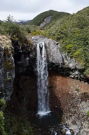 The source of the Mangawhero River is located on the slopes of Mt Ruapehu at elevation of approximately 1,800 m (5,900 ft). The river begins within the area of the Tūroa skifield and flows down the slopes of the mountain in a south west direction. The Ohakune Mountain Road, built during the 1950s and 60s, follows the river valley up to the skifield.[3] The 25 m (82 ft) high Mangawhero Falls is located in this top section of the river and is accessible via a short walk from Ohakune Mountain Road. [4]