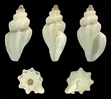 The shell is pale yellowish or almost white. It shows distant strong ribs. The shoulder has brown dashes or spots, appearing on the ribs only. There is usually, on the body whorl a central line of spots, also on the ribs.[2]