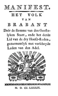 The Manifesto of the People of Brabant (French: Manifeste du peuple brabançon, Dutch: Manifest van het Brabantse Volk) was a document made public at the start of the Brabant Revolution in 1789 proclaiming the end of the domination of the House of Austria over the Duchy of Brabant. It was first written in French and then printed in French and Dutch.