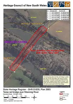 - 1 2 3 4 5 "Taree rail bridge over Manning River". New South Wales State Heritage Register. Department of Planning & Environment. H01059. Retrieved 2 June 2018.