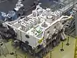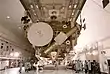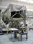At the SSPF, ISS modules, trusses and solar arrays are prepped and made ready for launch. In this iconic building are two large 100,000 class clean work environment areas.[27] Workers and engineers wear full non-contaminant clothing while working. Modules receive cleaning and polishing, and some areas are temporarily disassembled for the installation of cables, electrical systems and plumbing. Steel truss parts and module panels are assembled together with screws, bolts and connectors, some with insulation. In another area, shipments of spare materials are available for installation. International Standard Payload Rack frames are assembled and welded together, allowing the installation of instruments, machines and science experiment boxes to be fitted. Once racks are fully assembled, they are hoisted by a special manually operated robotic crane and carefully maneuvered into place inside the space station modules. Each rack weighs from 700 to 1,100 kg, and connect inside the module on special mounts with screws and latches.[28]