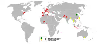 Gold accounted for some 80% of mining activity in the mid-2000s, while there remain considerable proven reserves of other minerals not currently exploited. Gold has become Mali's largest export,[13] after cotton—historically the basis of Mali's export industry—and livestock. The emergence of gold as Mali's leading export product since 1999 has helped mitigate some of the negative impacts caused by fluctuations in world cotton markets and loss of trade from the Ivorian Civil War to the south.[18] Large private investments in gold mining include Anglogold-Ashanti ($250 million) in Sadiola and Yatela, and Randgold Resources ($140 million) in Morila – both multinational South African companies located respectively in the north-western and southern parts of the country.
