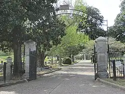 Maple Hill Cemetery (also known as Evergreen Cemetery) is located on Holly Street, north of the center of Helena, Arkansas. It is set on 37 acres (15 ha) of land on the east side of Crowley's Ridge, overlooking the Mississippi River, and is the city's largest cemetery. The cemetery was established in 1865, and is laid out in the rural cemetery style which was popular in the mid-19th century. It departs from the norms of this style in retaining a largely rectilinear layout despite having parklike features. The cemetery's entrance is through an elaborately-decorated wrought iron archway, whose posts were given in 1914, and whose arch was given in 1975. The largest monument in the cemetery is the Coolidge Monument, placed by Henry P. Coolidge on the family plot, which is at the highest point of section 3; the monument is a granite column 21 feet (6.4 m) in height, with a life-size sculpture of Coolidge on top.[2]