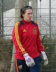 She is a member of the Spain women's national football team,[3] where she is a reserve goalkeeper as of the 2013 European Championship qualifying.[4] When regular custodian Ainhoa Tirapu was injured, Mariajo stood in for qualifying games against Switzerland[5] and Turkey.